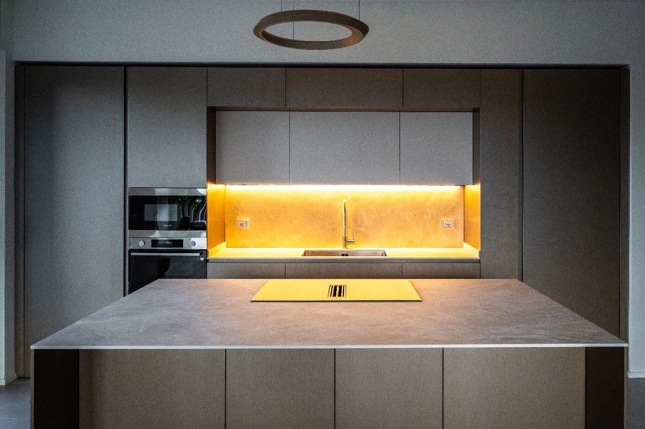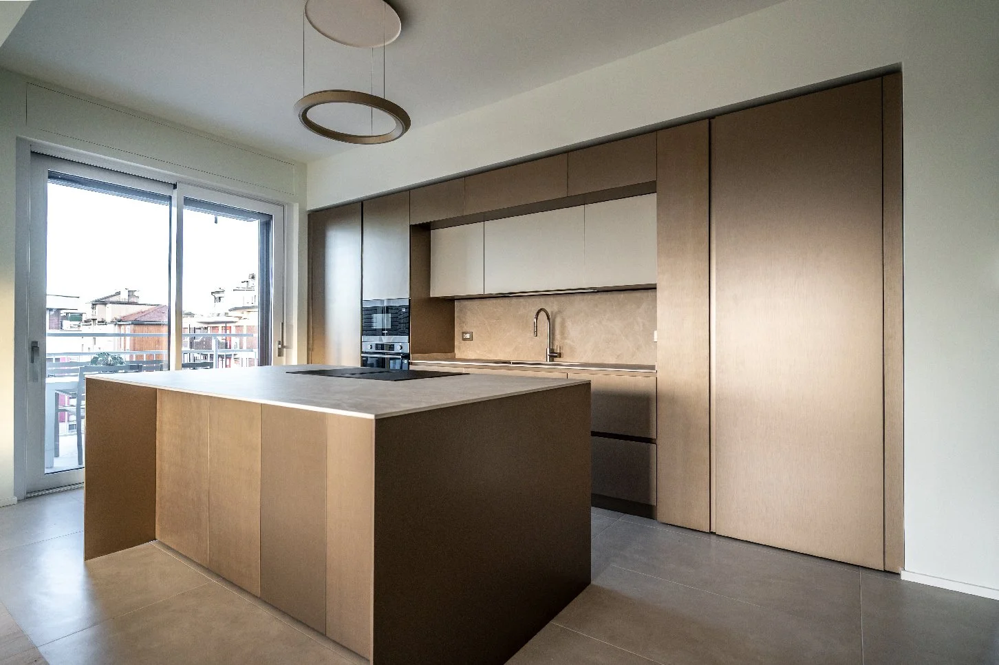 La cucina non è stata intesa come un semplice ambiente funzionale, ma come il vero baricentro architettonico della casa, capace di dialogare con la luce naturale e lo skyline mozzafiato.
