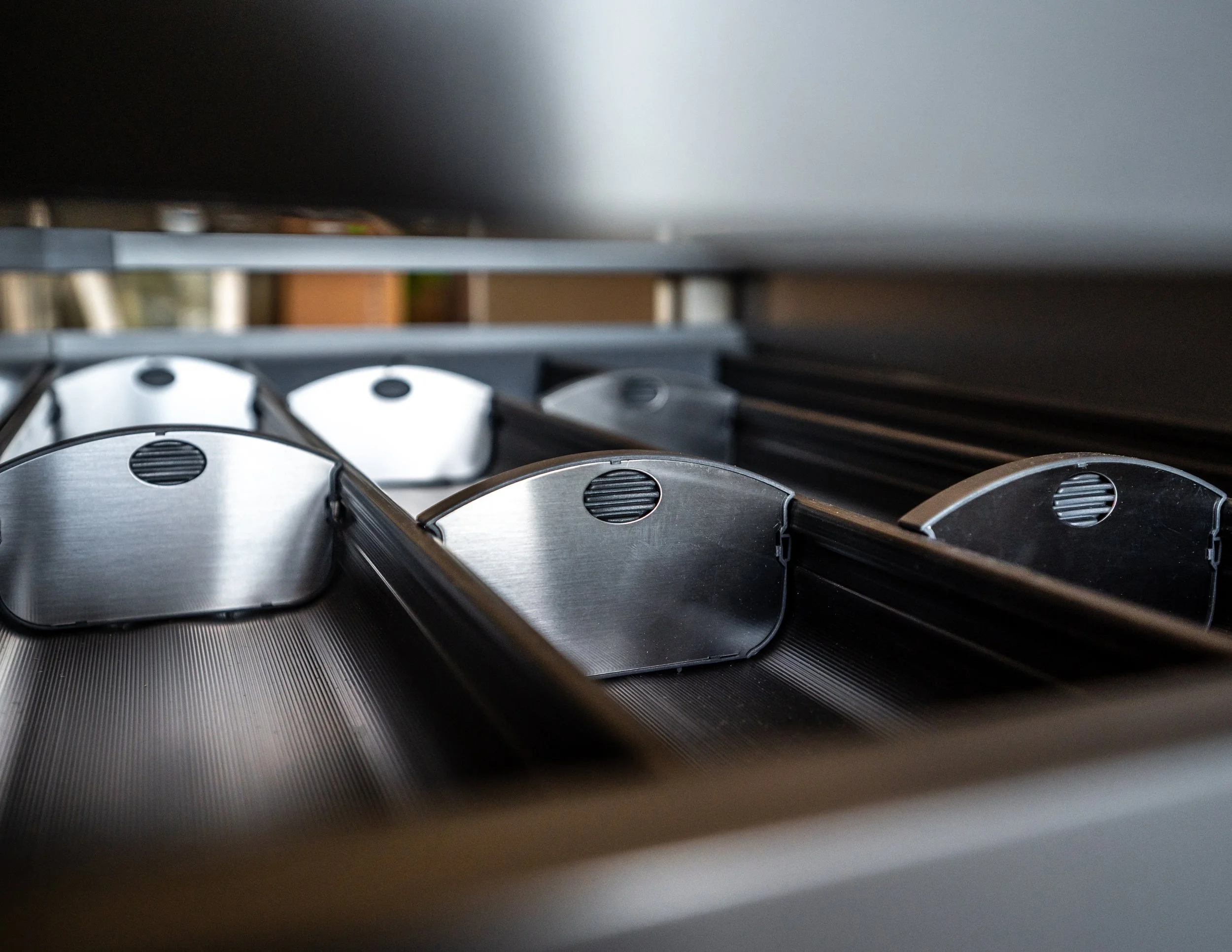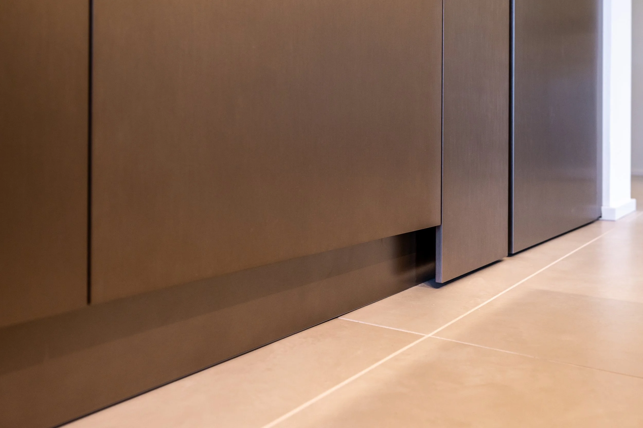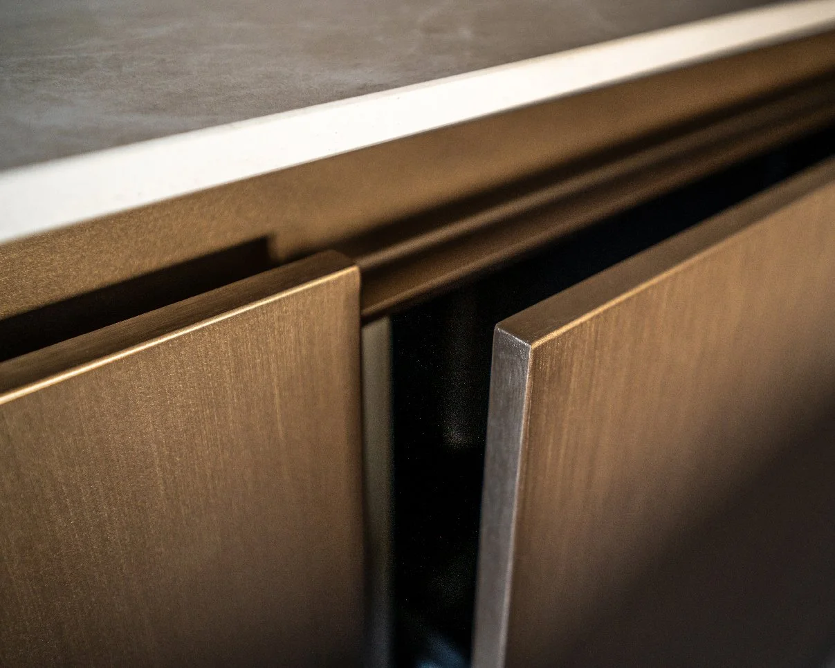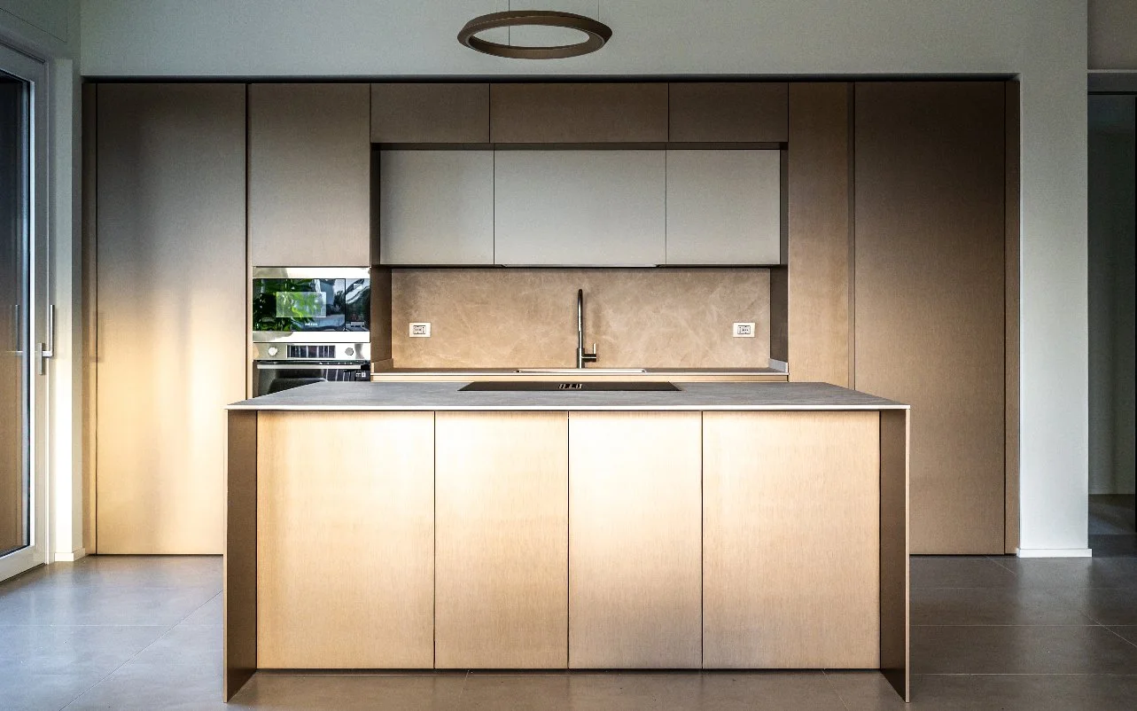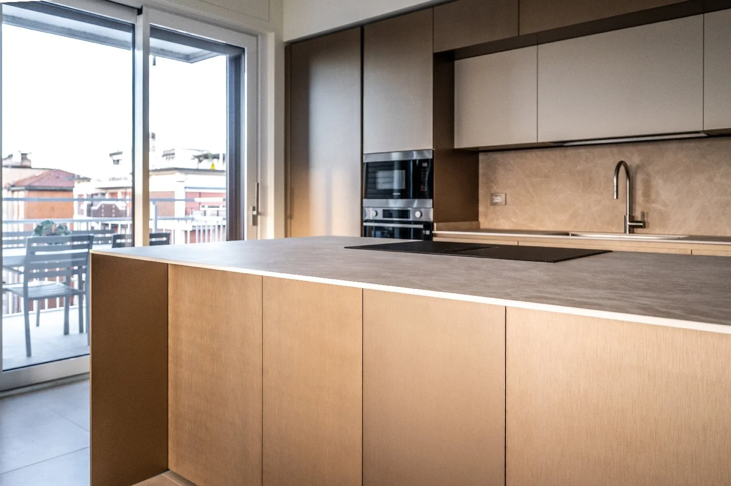 Per soddisfare questa richiesta di unicità, abbiamo puntato sull’innovazione del sistema D12 di Doimo Cucine. Il cuore del progetto risiede nella sua anta ultra-sottile: soli 12 mm di spessore, realizzati con un’anima in alluminio alveolare.