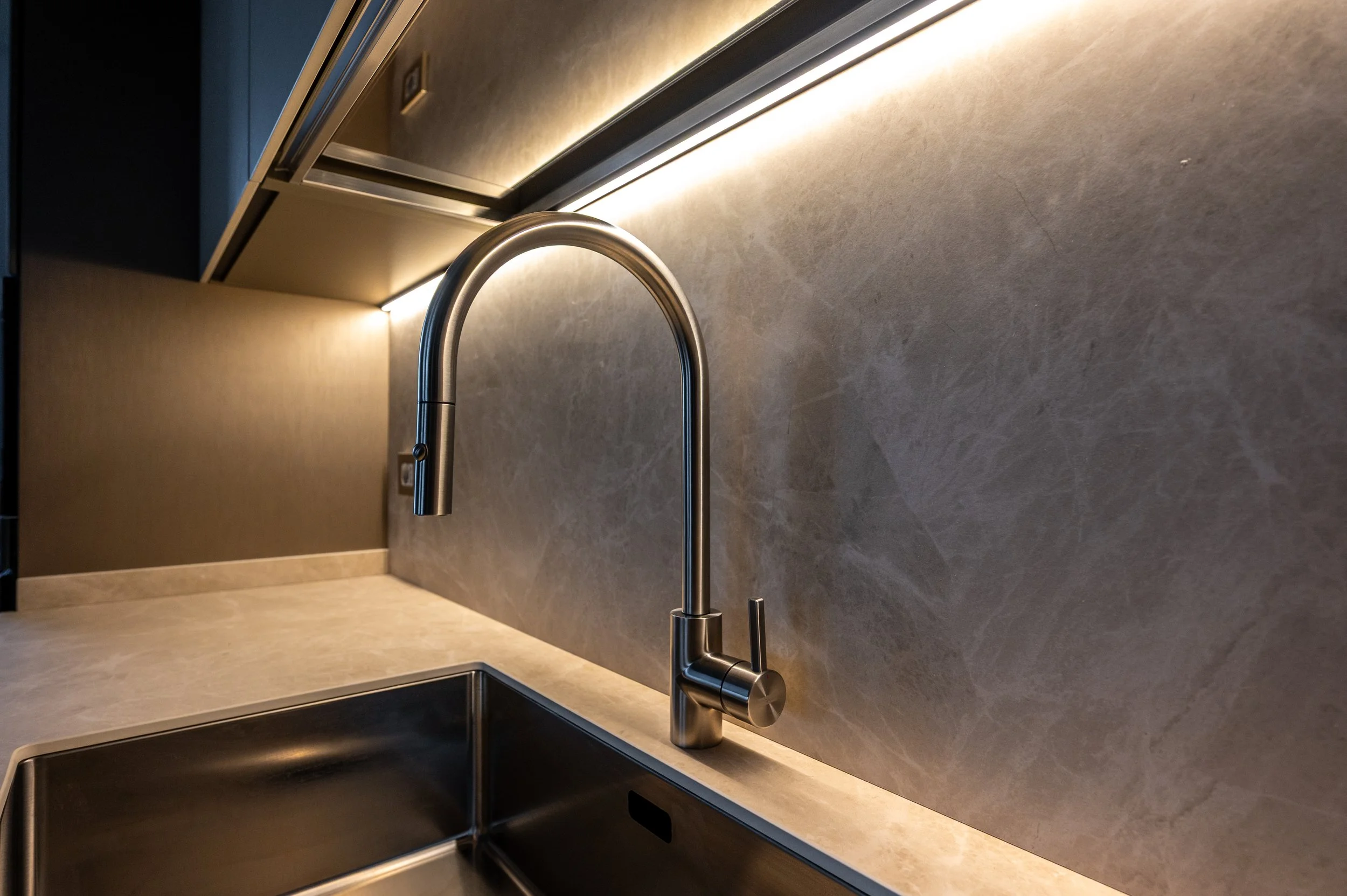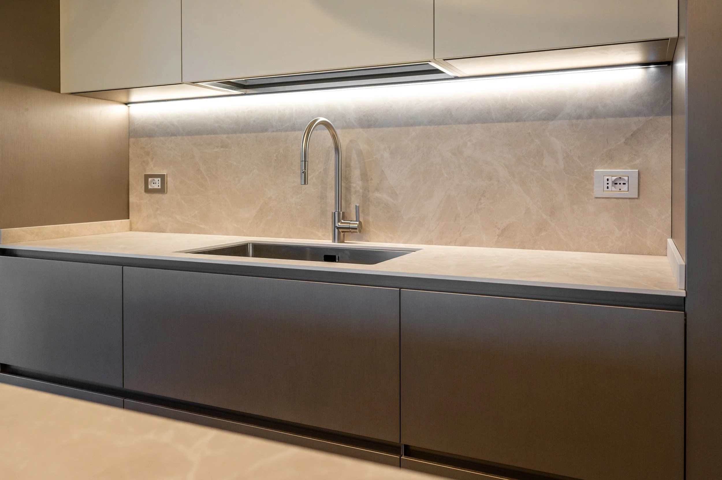 Un progetto dove il rigore dell'alluminio e la delicatezza del platino si fondono, trasformando la cucina nella protagonista indiscussa dell'intera casa.