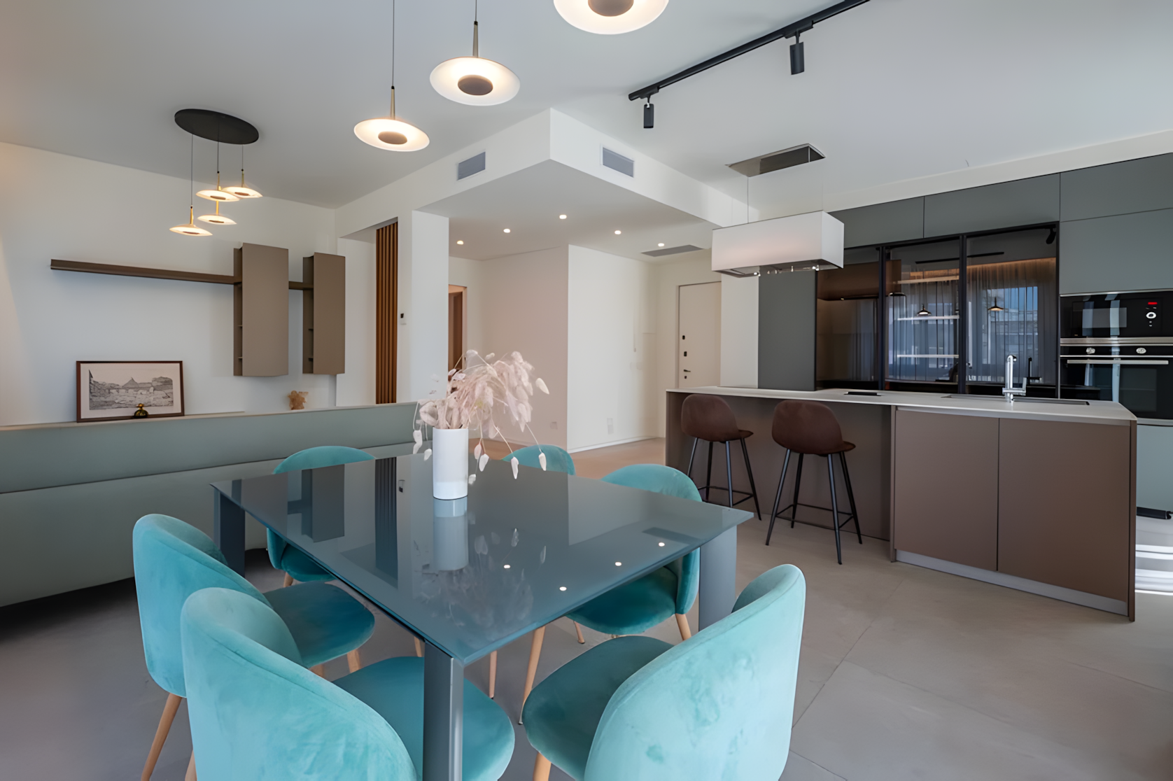 In addition to the kitchen, Colab Design furnished the rest of the open space. High-quality materials, harmonious colors, and sophisticated finishes created an apartment with a sophisticated atmosphere, where every element was designed to ensure comfort and style.